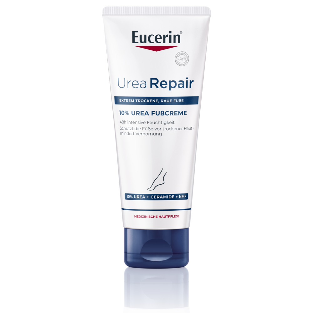 Die Eucerin UreaRepair PLUS Fußcreme 10% versorgt extrem trockene und raue Füße, auch rissige Fersen, mit der nötigen Intensivpflege. Der einzigartige, hautverwandte Repair-PLUS-Komplex mit Urea und weiteren natürlichen Feuchthaltefaktoren (Natural Moisturing Factor = NMF) spendet auch bei Hornhaut, Schrunden und Druckstellen lang anhaltende Feuchtigkeit. Zusätzlich stärken Ceramide die physiologische Hautbarriere, damit die Feuchtigkeit nicht entweichen kann.