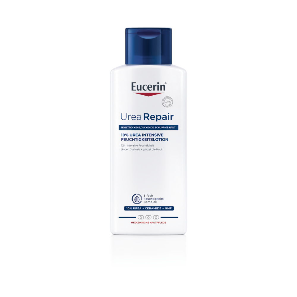Die Eucerin UreaRepair PLUS Lotion 10% enthält den einzigartigen, hautverwandten Repair-PLUS-Komplex: Urea und natürliche Feuchthaltefaktoren (Natural Moisturing Factor = NMF) spenden und binden intensiv Feuchtigkeit und sorgen so für einen gesunden Feuchtigkeitsgehalt der Haut. Zusätzlich stärken Ceramide die physiologische Hautbarriere, damit die Feuchtigkeit nicht entweichen kann.
